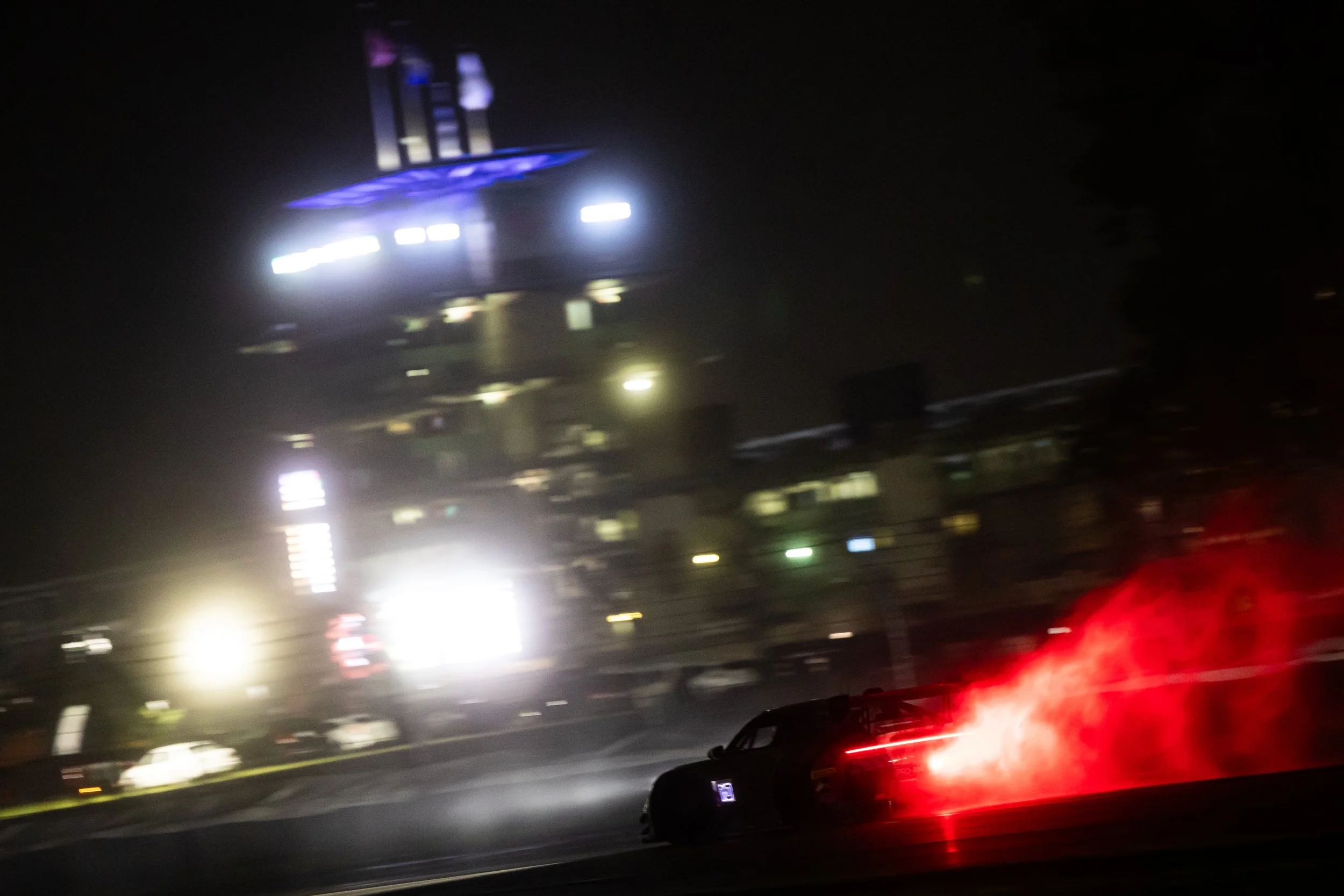 The #77 AO Racing Porsche 911 GT3.R runs through the night during the 28th annual Motul Petit Le Mans on Oct 11, 2025 at Michelin Raceway Road Atlanta.